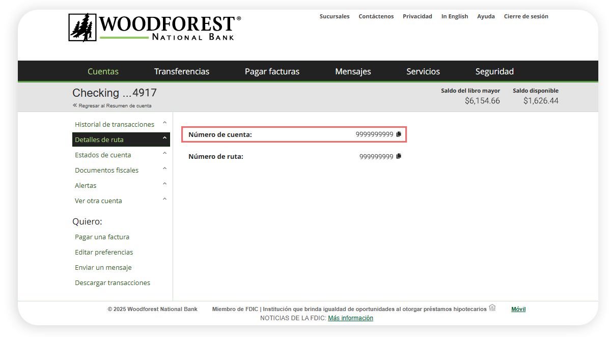 Los números de cuenta y de ruta pueden encontrarse en la Banca en Línea de Woodforest y nuestra Aplicación de Banca Móvil.