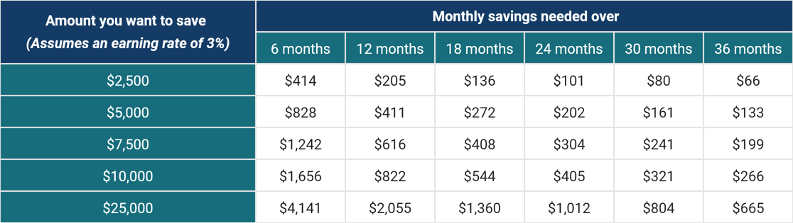 You don’t need to save hundreds or thousands of dollars each paycheck to make a difference in your finances. You can start small and build your savings over time. You can also gradually increase the amount you save each month as you adjust to your new budget. The choice is up to you. Here are a couple of charts showing how much you can save monthly to reach your goals.